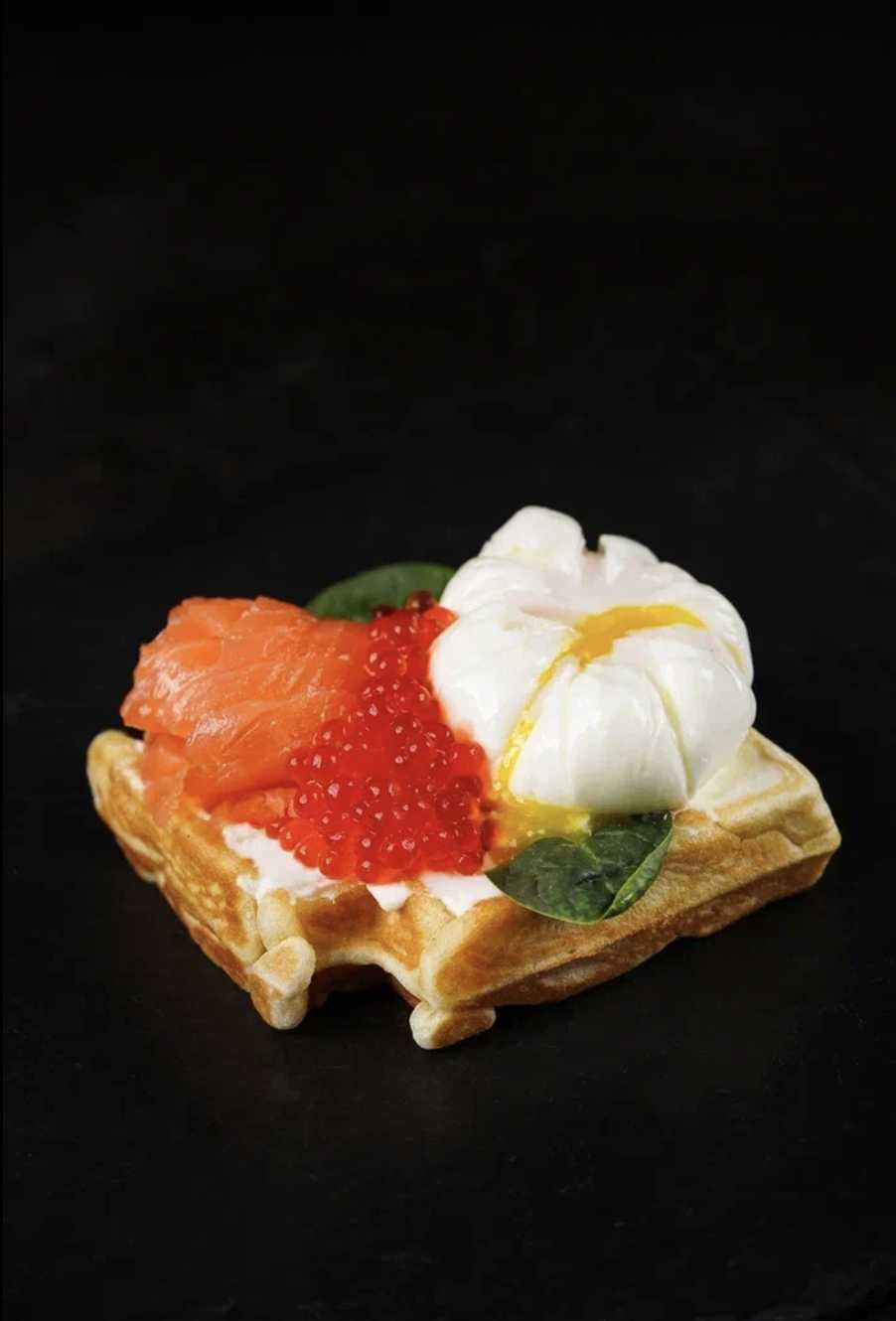 Венская вафля, намазка творожная, яйцо пашот, лист салата, икра красная
