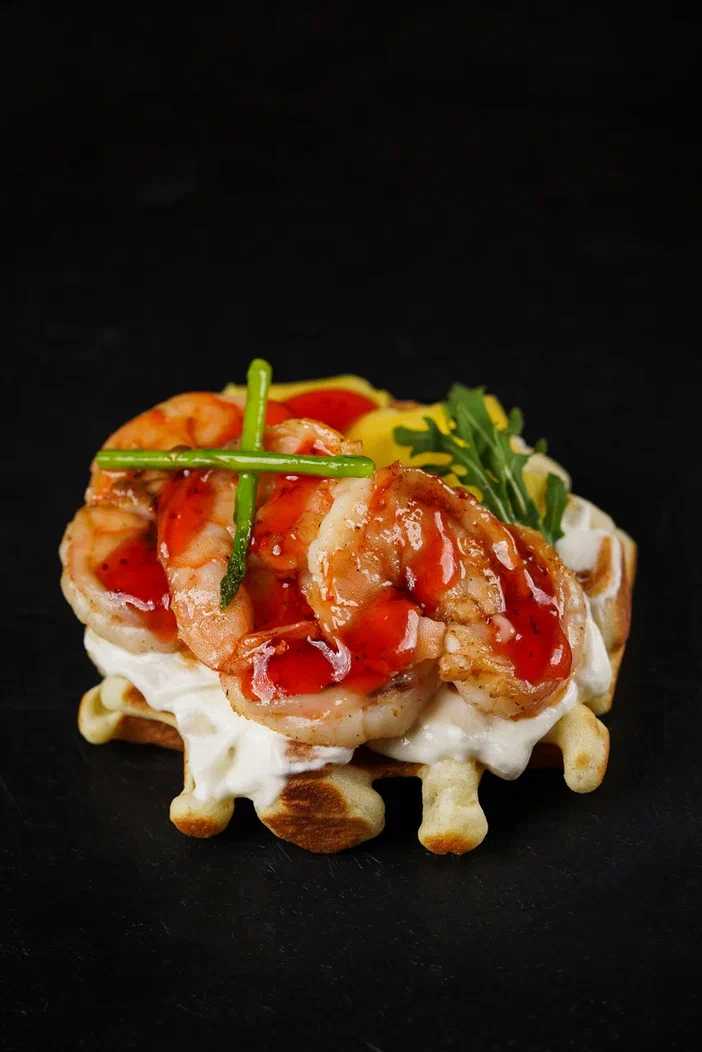 Венская вафля, намазка творожная, тигровая креветка гриль, лист салата, авокадо, икра красная, соус манго-базилик