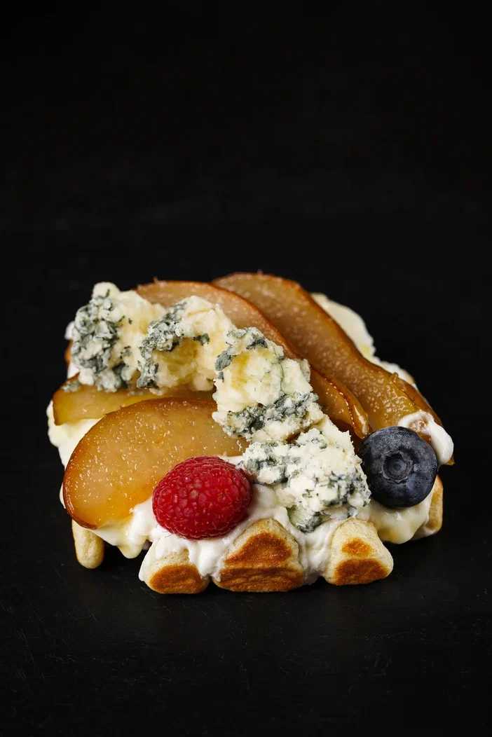 Вафли с томленой грушей и голубым сыром