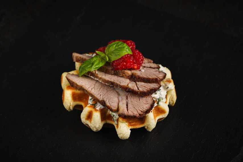Вафли с утиным филе и малиной