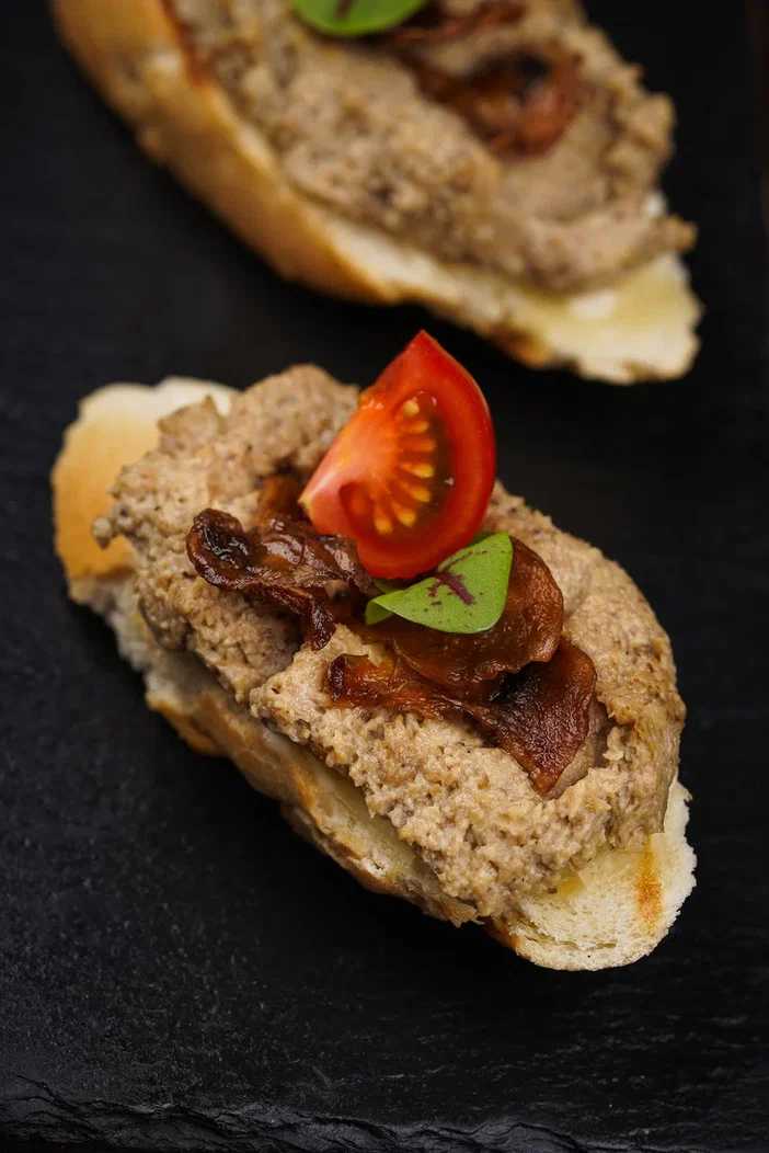 Хрустящий багет, риет из шампиньонов, микрозелень, помидоры черри
