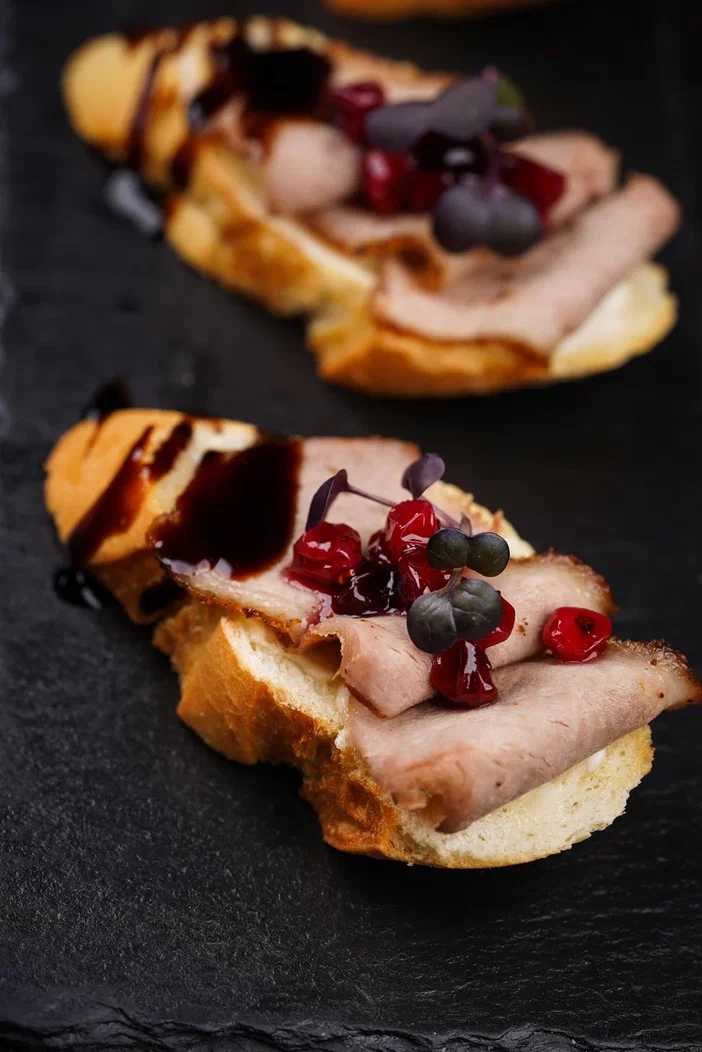 Брускетта с утиным филе и клюквой