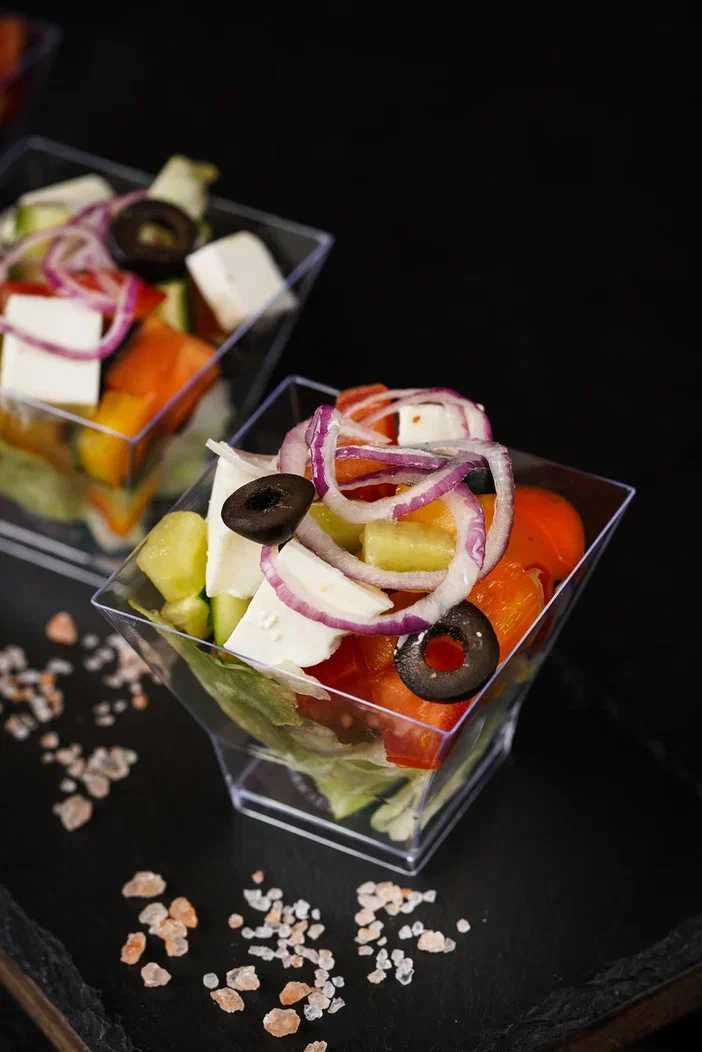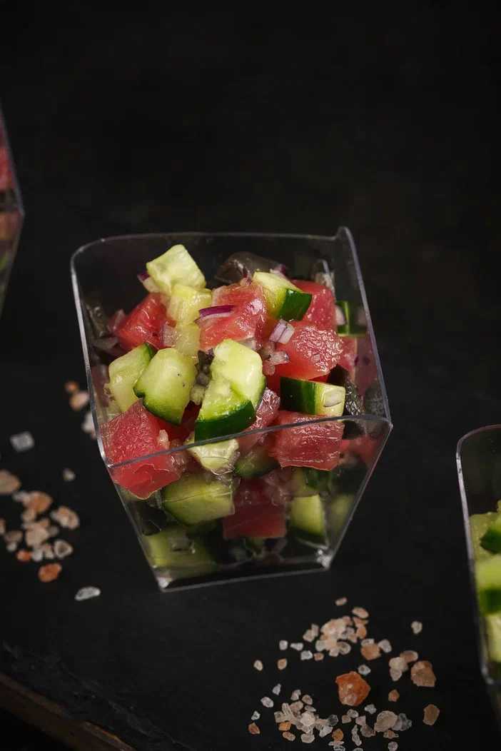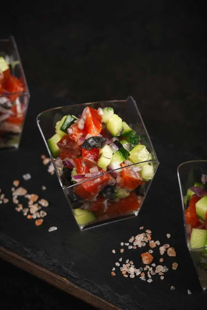Лосось, огурец, красный лук, маслины, микрозелень, соль, перец