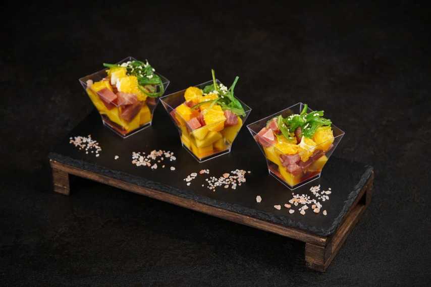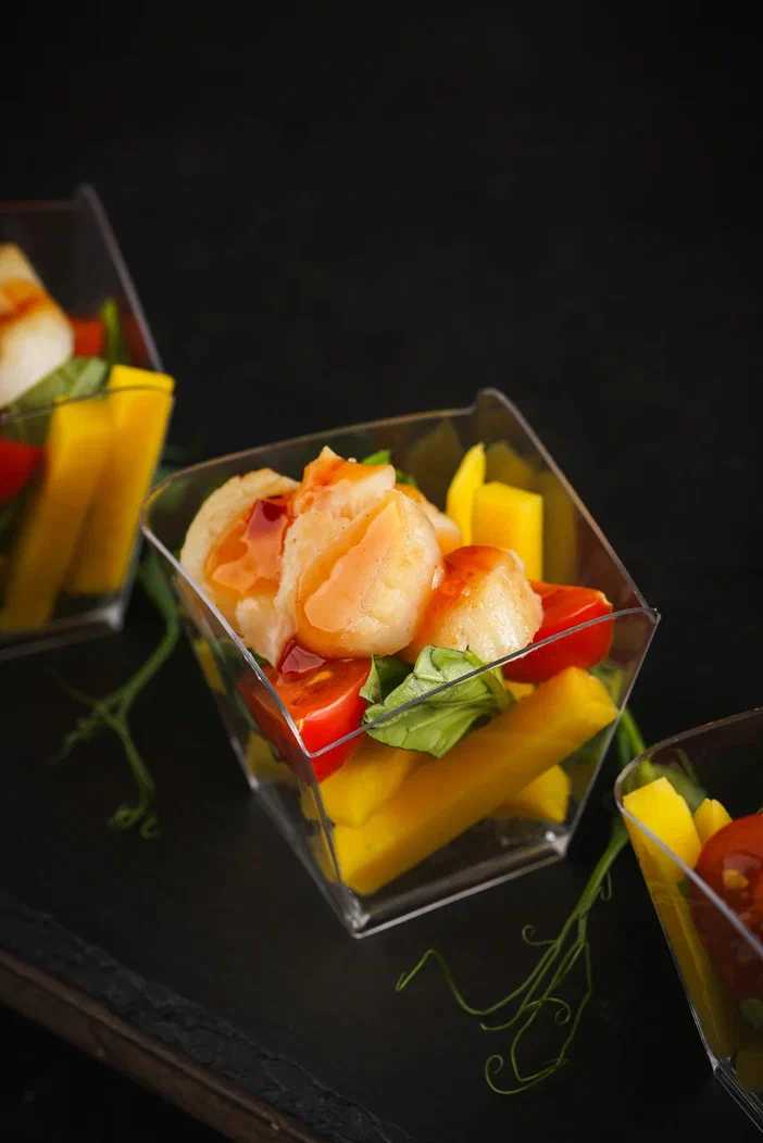 Вафли с креветкой, авокадо и соусом манго-базилик