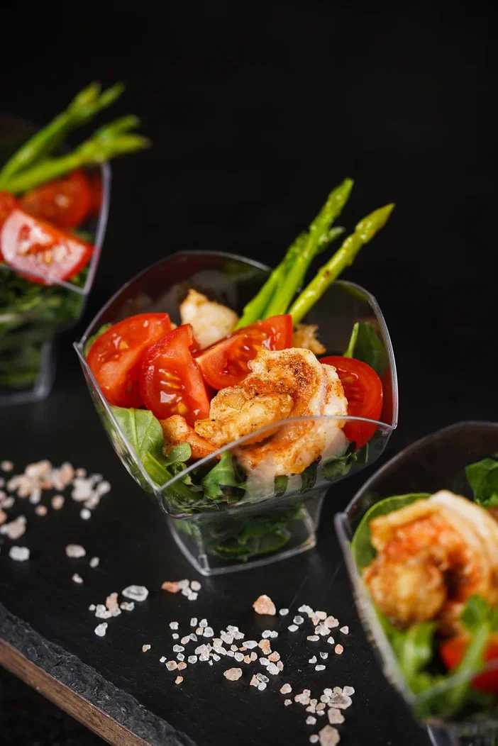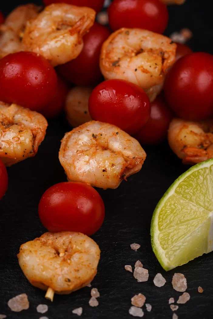 Обжаренные креветки со свежими томатами черри на шпажке