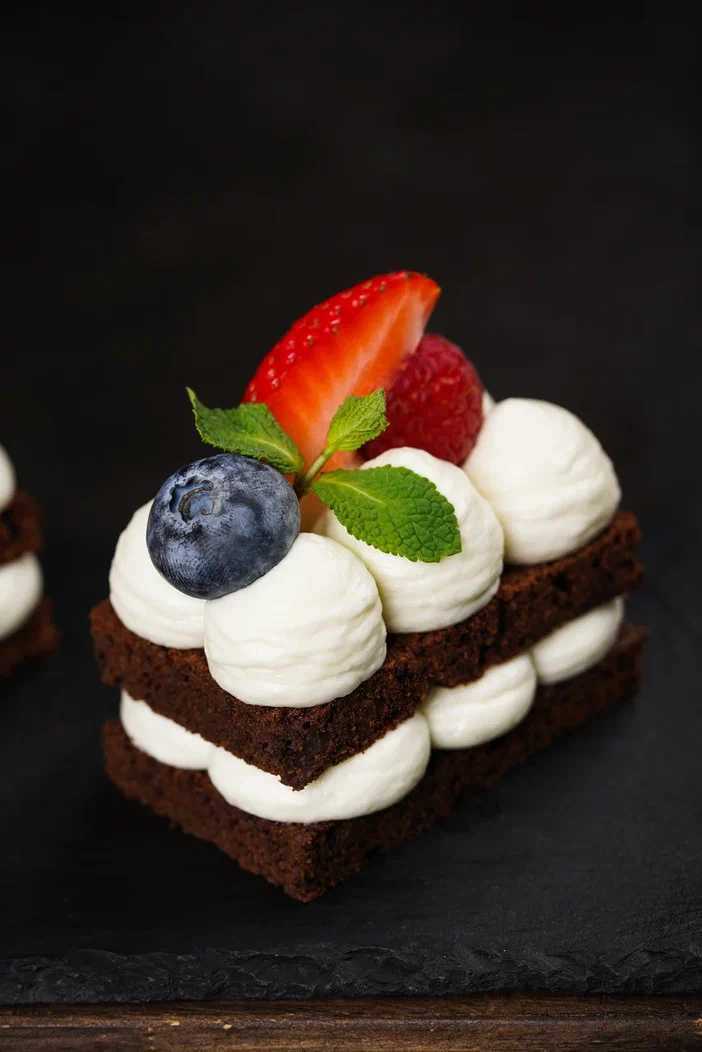 Бисквит брауни, творожно-сливочный крем, сезонная ягода