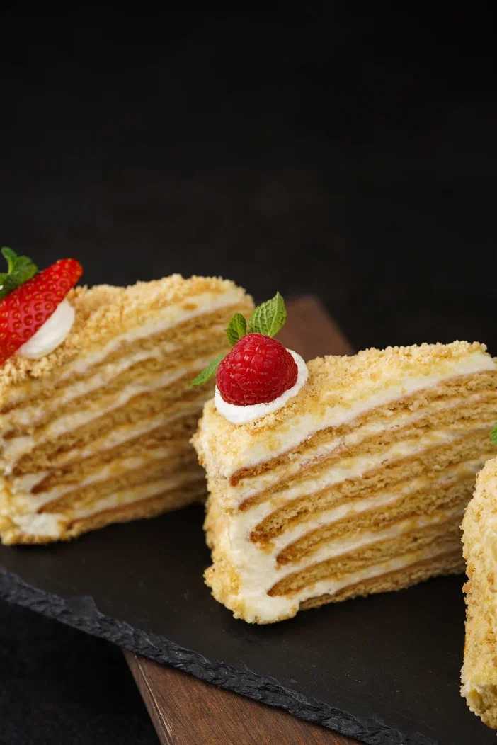 Нежный бисквит, заварной крем, ягода сезонная, мята