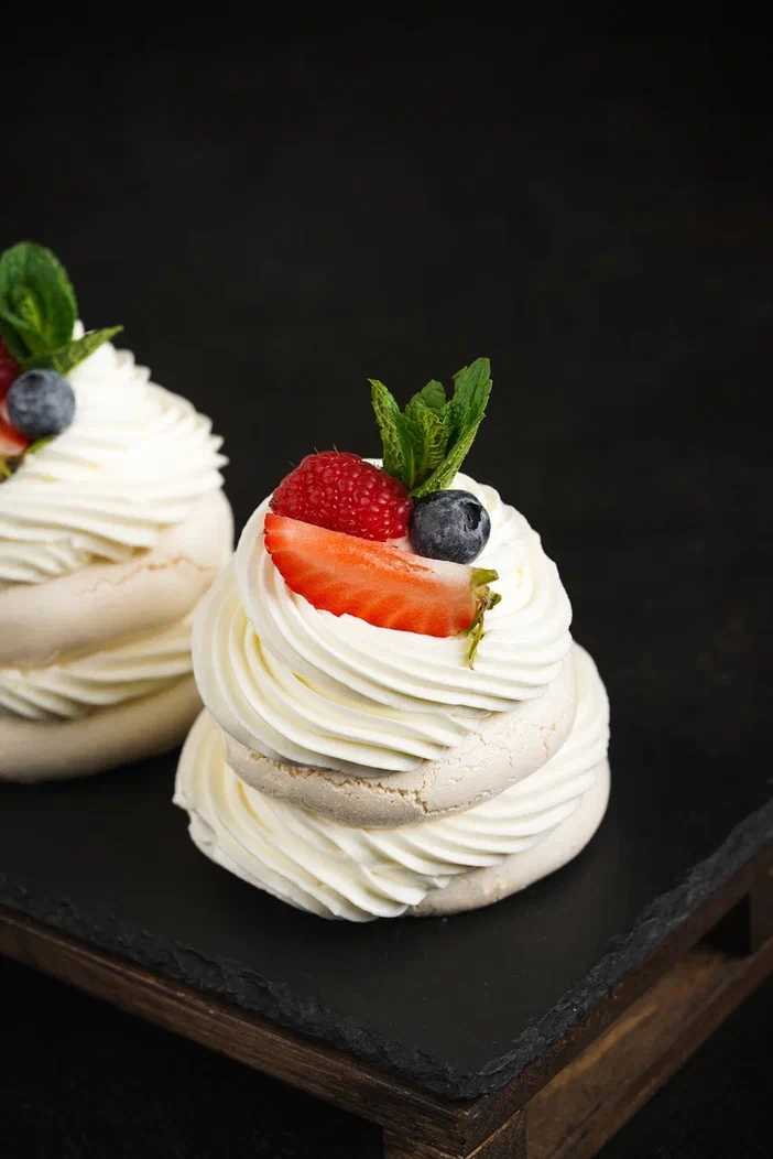 Хрустящее безе, крем творожно-сливочный, ягода сезонная, мята